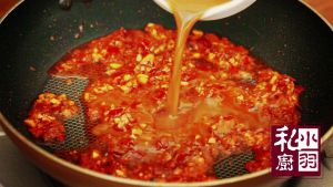 ▲炒锅烧热倒油,先放入2大勺郫县豆瓣酱炒出红油,再放入姜末和蒜末炒出香味,然后放入之前调好的料汁。