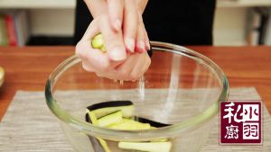 ▲放到一个大碗里,撒少许的盐,腌上十分钟,然后用手把茄子里的水攥出来。