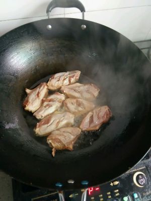 锅烧热倒人适量油,下姜片,桂皮八角炒出香味。把鸡翅一块块下入。煎至表皮稍金黄。