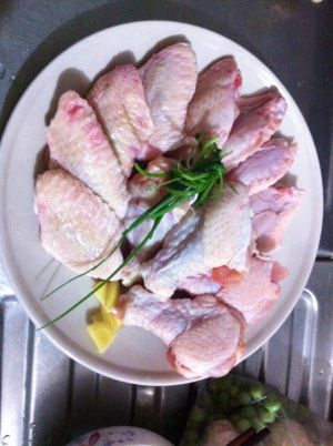 鸡翅鸡腿用水焯一下,水中加料酒,去腥。
