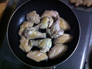锅内倒入少许油、用姜片把油涂匀锅底,鸡翅放在姜片上,煎至两面浅金黄色。