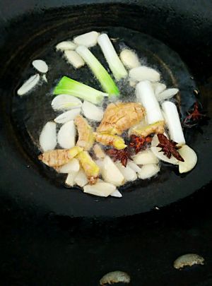 油热后放入葱、姜、蒜、八角爆出香味