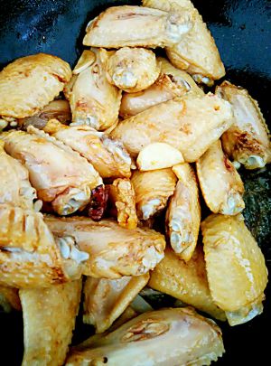 锅里热油加入适量冰糖,戴冰糖融化将鸡翅倒入锅中翻炒,待鸡翅着糖色。