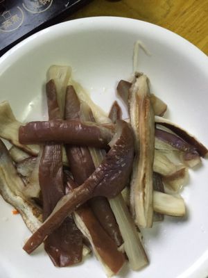 2.炒锅放油至8分热(油要稍微多点),把茄子放下去炸,等茄子软了就捞起沥油待用。