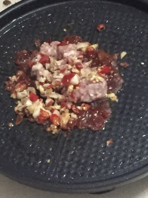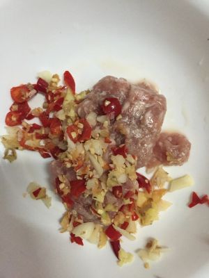 姜蒜辣椒剁碎,猪肉剁成肉沫