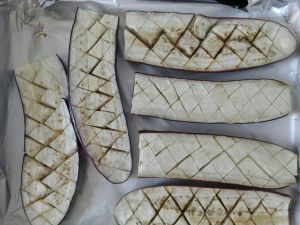 烤箱200℃预热10分钟,烤盘铺上锡纸,茄子表面抹上油,放入烤箱烤五分钟