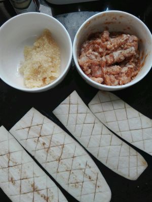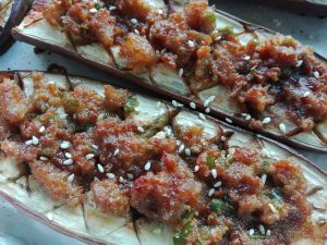 大蒜剁成末,肉末加入适量的蚝油、盐、胡椒粉腌制,茄子开边,然后用小刀划口子(容易熟和更入味),茄子蒸过再烤会没那么干