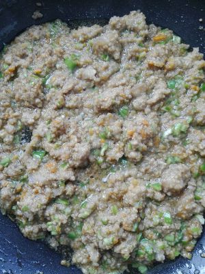 炸好的茄子捞起备用 锅内留点底油。把姜蒜葱 八角放入炒香 然后放入肉末 煸炒 放酱油 黄豆酱。胡萝卜滚刀切 和肉末一起炒