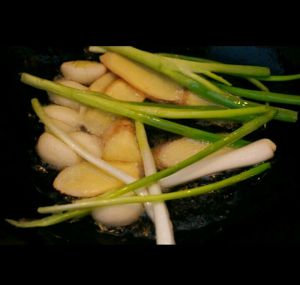 炒锅内留宽油,倒入姜蒜和大葱煸出香味。