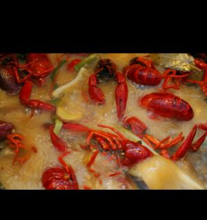 食用油油温加热至70度左右放入蒜,姜,花椒,辣椒段,草果,香叶,八角,郫县豆瓣,大葱炒香之后倒入虾尾爆炒。