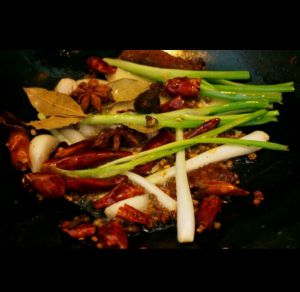 热油锅,放入八角,姜,干辣椒,蒜爆香。油要多放。