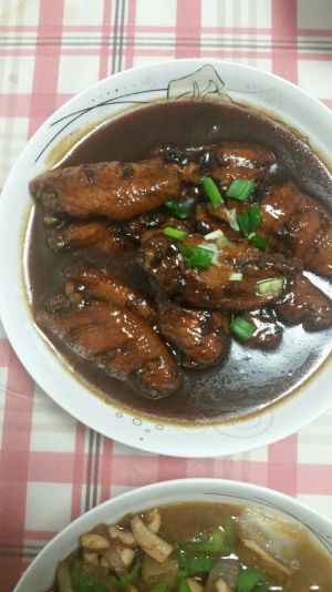 鸡中翅淖水,提前一晚用酱油,蚝油,姜,蒜腌好。