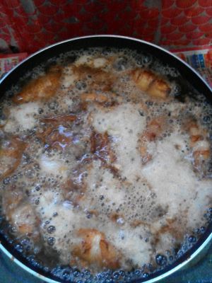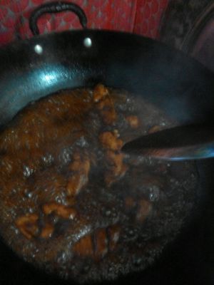 倒入鸡翅,小火慢慢炸,放入老抽上色,白砂糖,醋