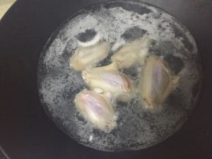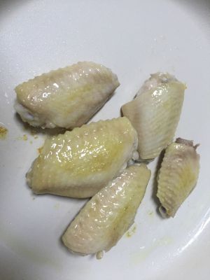 汆好的鸡翅水滤干,放入煎锅煎到两面微微金黄。