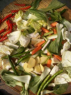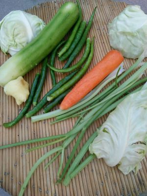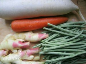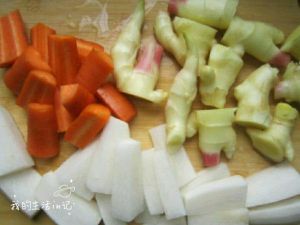 表面的水干透后,把萝卜切块,包菜掰散,姜切片,芹菜切断,继续晾干
