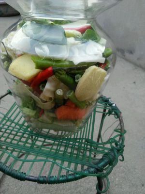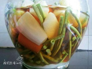 放置阴凉处三天揭盖查看,表面会结出白霜,这是正常的,因为有些食材内含大量水分,如果结霜比较多可以用勺子把表面的霜打掉,再倒点米酒,白酒也可。一点就行,不用太多。盖上盖子继续发酵,在北方天气比较干燥记得及时在坛沿边的水不要干掉了,我还没有买到水萝卜所以还没有放。