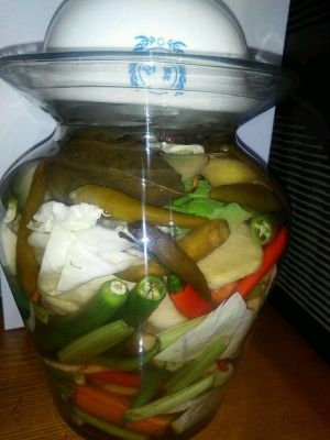 先在坛子底部撒一把花椒,(水和盐的比例为10:2)将调好的盐水倒进坛子,大概就行,不用很精确,盐多了就咸一点,后期泡菜多放几次也就淡了,盐少了的话,后面随时都可以加,倒一点白醋,象征性的放点就可以了,其他都不用放了。将晾干的食材放入,水要没过食材,先放长豆角在底部,然后放其他食材。小米椒会浮在表面。密封坛子,盖上盖子浇上坛沿水。