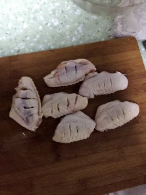 解冻好之后沥干水分,用刀给鸡翅切几道口子,方便腌制入味