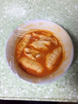 鸡翅中洗净放烤翅粉适量凉开水拌匀密封放冰箱腌制一夜。