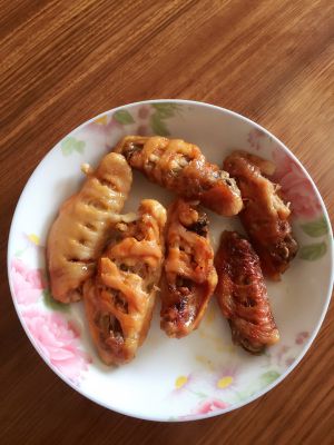 隔天烤的时候拿出鸡翅,沥干水分,倒一点蜂蜜掺水,把鸡翅分开摆放盘子里,用刷子2面给鸡翅刷蜂蜜水,然后放微波炉里的烤盘开烤,设置10分钟就好