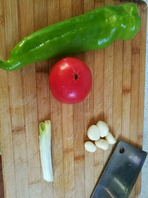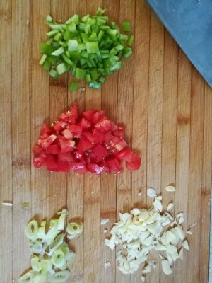 茄子土豆切滚刀片,青椒切片,葱姜蒜切末。