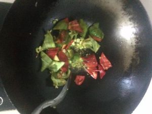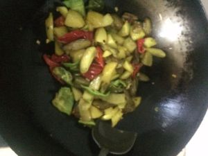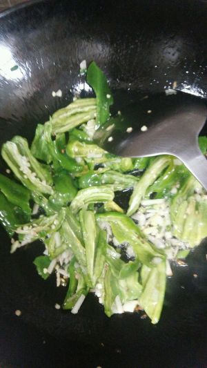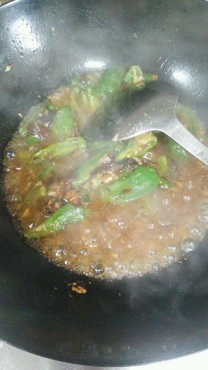 待辣椒炒熟放入调好的调料不停的翻炒再加入半碗水不停翻炒