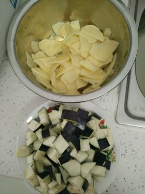 土豆去皮,冼净切成滚刀块。大茭去把去籽,切成三角块,茄子去皮洗净切成三厘米的菱形块。