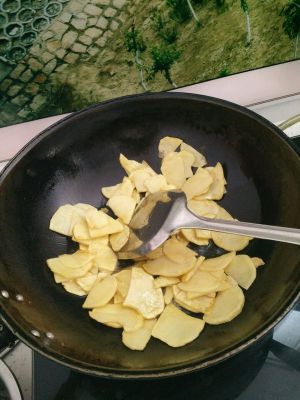 锅里烧油,待油烧热后放入茄子和土豆炸成金黄色后捞出