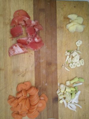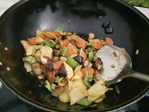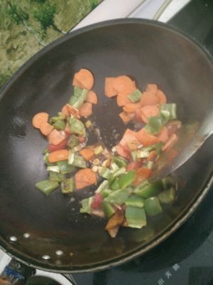 锅里少放油,油热放肉片、胡萝卜、青椒、姜翻炒一下,在放入茄子与土豆,再倒入提前挑好的酱汁。