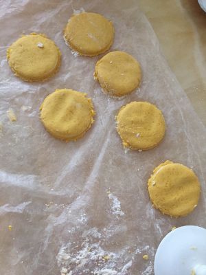 将搓成小球的南瓜压成饼状,放在烤盘中,南瓜表面用刷子刷上水,撒上白芝麻。