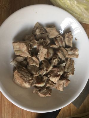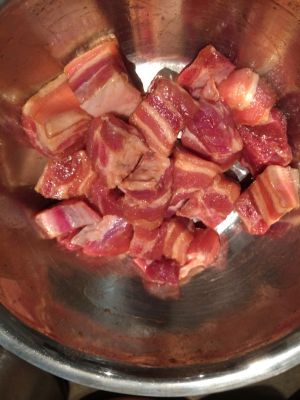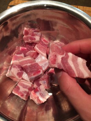选择鲜唐排 因为肥肉夹在瘦肉中 层层叠叠 肥肉经过炒制后会脱油 使口感酥嫩(其他排骨也可以 注意充分解冻 )切的大小尽量按照一块肉留一个骨头