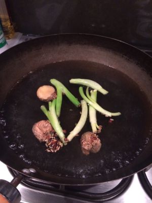 将葱,蒜,姜,备用,热锅,加入辅料爆香加入排骨。