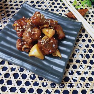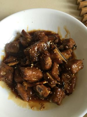 锅中留一点底油姜片爆香放入小排翻炒一下,放味极鲜,香醋,白糖,少许,小半碗开水。倒入小排,闷煮二分钟,收汁。盛盘,家里没白芝麻了,撒点白芝麻更棒