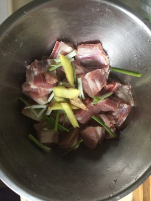 肋排洗净加葱,姜,少许盐,料酒,拌匀腌制20分钟左右