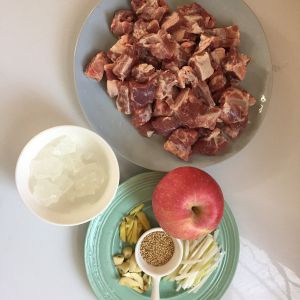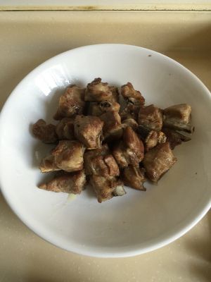 将洗净漏干仔排,放入器皿内加料酒少量、姜、、盐2克,糖2克,淹制10分钟。