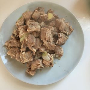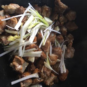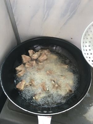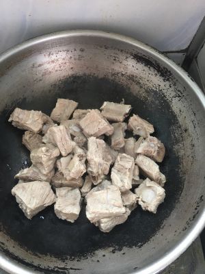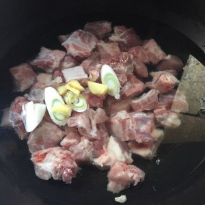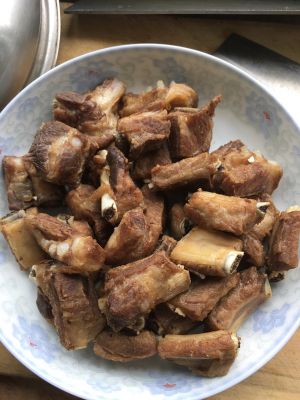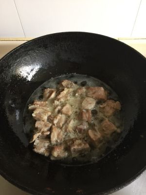 下排骨翻炒,加水和醋,大火收干。如嫌味淡,此步骤可以加盐。