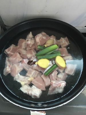 准备好焯水 姜 葱 花椒 大料 少量盐 温水下排骨 加老抽