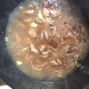 将炸好仔排倒入锅中加姜、葱、料酒、糖、猛火烧开转中火煮。