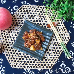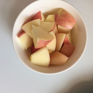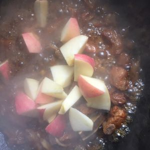 待锅中汤汁还有一小半的时候放入苹果翻炒均匀,接着盖上锅盖炖煮差不多就可以出锅啦!如果想收的干点要不停翻炒,防止粘锅,最后撒上白芝麻就可以啦!