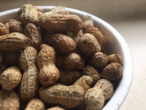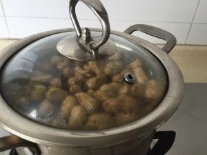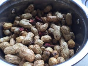 锅内加水,下花生果、精盐、生姜、八角、三柰、花椒煮1个小时;浸泡半天后取出花生果装盘上桌。