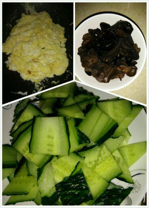 黄瓜切片,木耳泡发,鸡蛋炒熟备用。