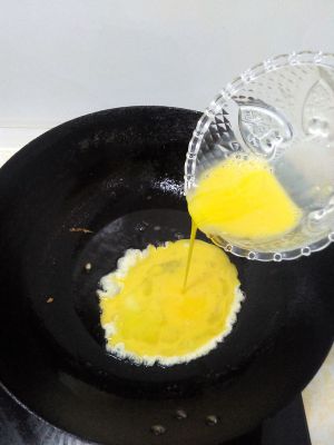 锅中油烧开放入鸡蛋,鸡蛋炒的嫩嫩的,盛出