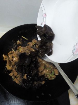 锅里放油烧热加葱姜末爆香,放盐、糖适量,放入肉片,肉片八成熟后加入黑木耳和蒜台。