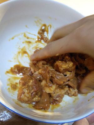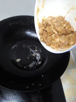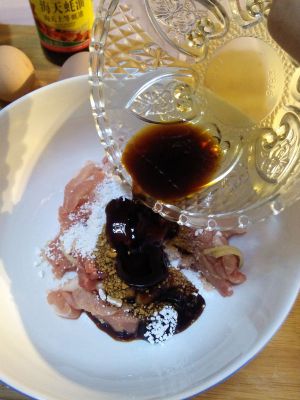 把淀粉、耗油、酱油倒入切好的猪肉里面