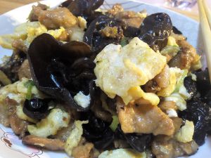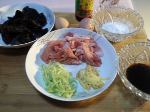 黑木耳温水浸泡至发,猪肉切片,鸡蛋炒熟。