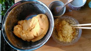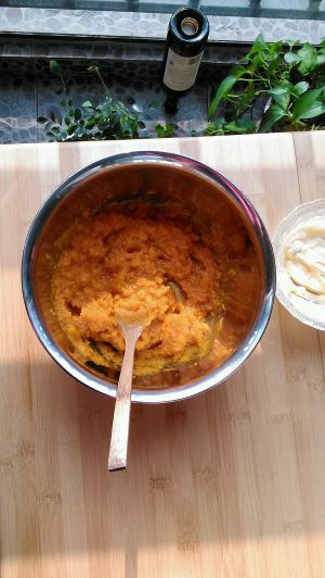 南瓜蓉和糯米粉搅拌均匀,觉得太粘连可以加适量玉米面粉,拌至干湿适度能容易包住馅的面团,面团根据各自口味加糖