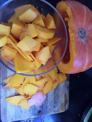南瓜洗干净切开,掏籽去皮,切成块状。