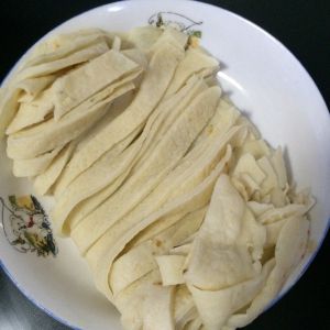 鸡蛋饼皮切成条状,类似粗面条