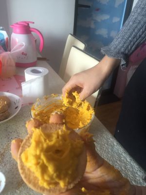 将混合好的南瓜馅放在饼干上,注意不要太多