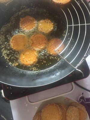 搓圆之后压扁成圆饼状之后下锅啦